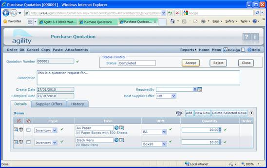 Completed quotation can either be accepted for order or rejected by using one of the buttons in the status control section of the quotation form:
