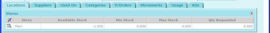 The Stores Grid shows the Store Locations, along with the available stock in that store, where the inventory item can be held.