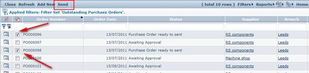 To perform a multiple bulk send from the purchase order scan form, simply select the required purchase orders from using the select boxes by ticking them.