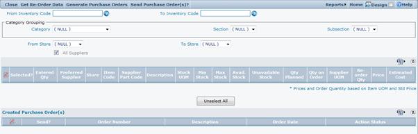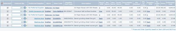 The user should examine the grid contents, de-select any items that they do not wish to order at this time and/or adjust any order quantities. Once that is complete then purchase orders can be automatically generated from the re-order data.