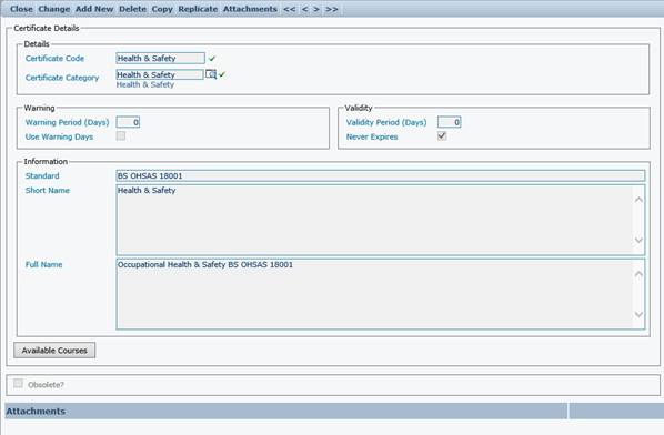 Certificates are the core element to training records and must exist in the system prior to training courses being defined or labour training records being created.