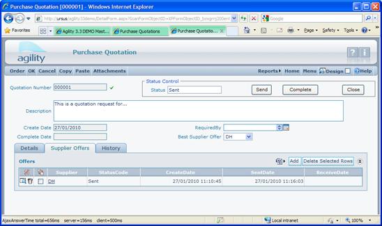 After this step is finished, there should be enough information in the quotation to be able to select the best offer and pass the quotation for acceptance. This can be done by clicking “Complete” button in the status control section of the form: