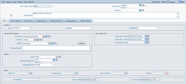 The work order detail form provides the most comprehensive options for data entry when completing the work order, as any aspect of the work order can be modified for all tasks. On opening the work order detail form, enter change mode by clicking on the change option in the menu bar.