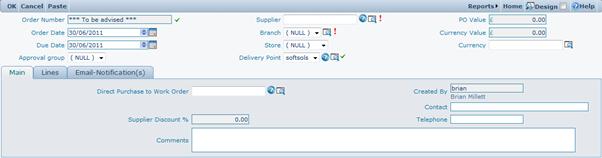 Finally click the ‘OK’ button on the menu bar to commit the order to the system. The status at which the purchase order will be depends on system configuration.