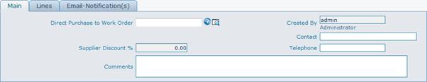 The main tab is an extension of the header information and contains the work order reference for direct purchases and some free text fields for additional useful data.
