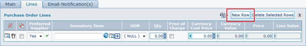 Select the ‘new row’ option from the ‘Purchase order lines’ grid. This will create a new blank line.