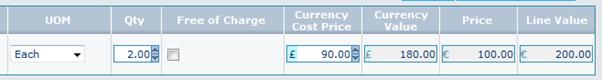 Purchase orders can be raised in currencies other than the system base currency, so that suppliers who operate in a different currency can be accommodated. This is reflected on the purchase order line detail shown below. The currency is based upon the supplier record and needs to be defined in the system first with an exchange rate. Please refer to the currency in the standing data section for information on how to do this. If supplier and base currency are the same then the currency and system price fields will display the same values.