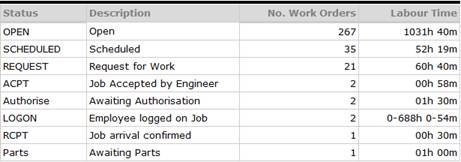 The current load status analysis provides an overview of the overall allocated time required to completed open work orders. The report returns this as a breakdown of work order status showing the total remaining time required for each status.