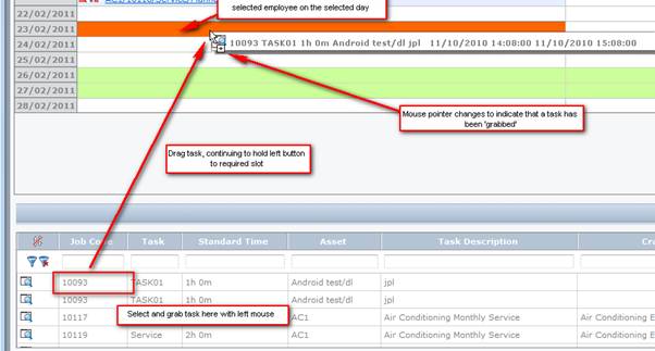 Scheduling a task is done using a drag and drop technique. The selected task is ‘grabbed’ from the tasks grid by selecting it by clicking on it and holding the left mouse button. Whilst continuing to hold the left mouse button the task is then dragged to the required slot on the scheduler grid and the left button is released which will drop the tasks onto the selected slot.