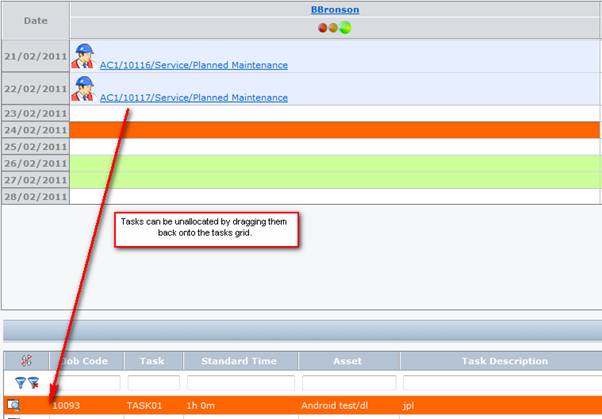 The tasks is selected and grabbed from the scheduling grid, dragged and dropped back onto the tasks grid. This action will unallocated the task and allow the task to be allocated to a different labour resource.