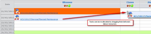 Tasks can also be moved between labour resources within the scheduler grid using the same drag and drop technique. This action will unallocated the task from the previous labour resource and re-allocate it to the new selected labour resource.