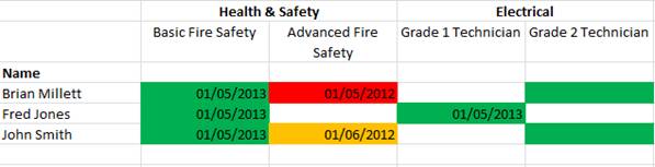 This shows a tabular matrix with employees ordered by employee name on each row and a RAG coloured cell indicating which certification is held and when it expires, with column grouping on either skill collection or certification category.
