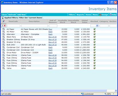 The details of an inventory item are entered through the Inventory Items detail form. Selecting ‘Inventory Items’ from the Inventory sub menu opens a scan form detailing all the inventory items defined in the system.
