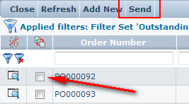 To send purchase orders, select one or more required purchase orders by clicking the checkbox on the order line and click the ‘send’ option at the top of the form.