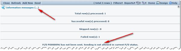 Only purchase orders that are at a status where sending is allowed can be sent. If any selected purchase orders cannot be sent then a detail message will be displayed at the top of the form. If the message is expanded by clicking on the three dots (…) then details of which purchase orders could not be sent will be shown. For more information on sending purchase orders please refer to the ‘Sending Purchase Orders’ section.