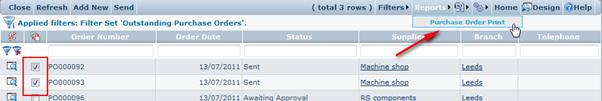Selecting purchase orders to print is performed in the same manner, by clicking the checkbox on the order line. Then click the ‘Reports’ menu and use the print purchase orders option.