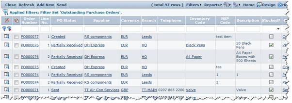 The scan shows a line for each purchase order meeting any specified form filter criteria. Form this form it is possible to drill into the detail of any individual purchase order and perform bulk printing or sending using the selection check boxes.