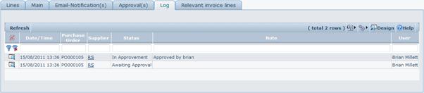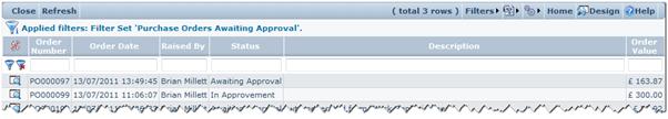 Pre-filtered for purchase orders that are at a status of awaiting approval or in approvement and where the logged on user is a member of the approval group assigned to the purchase order.