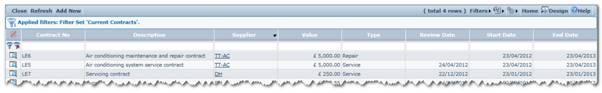 The scan form column definitions are the same as those defined on the service contracts detail form. The form is filtered by default on ‘current’ contracts, those where ‘now’ is within the start and end date defined on the contract.