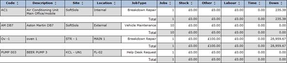 This report provides a tabular breakdown of equipment costs and downtime for each job type for a given date range. The report also provides an overall total cost value for each asset within the selected filter criteria.