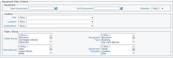 The equipment filter, a common element amongst many equipment based reports allows equipment rages to be selected for the report based upon the following criteria.