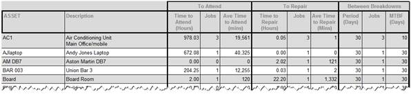This is the mean time before failure report which is designed to show the average time between breakdowns, attendance to breakdowns and repair time. This is done using 3 charts, displaying the summary element on the x-axis and averaged time on the y-axis. The summary element is the amount of detail you want to show; asset, grouped by sub-location, grouped by location or grouped by site with asset being the highest detail level. The final page shows the actual and average figures used in the calculations in a tabular listing.