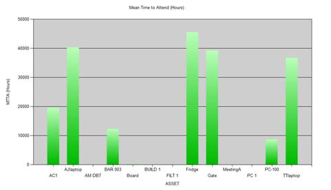 It can be seen from the MTBF chart that the item ‘AC1’ breaks down quite regularly, on average every ten days. However looking at this item on the ‘time to repair’ chart shows that it does not on average take long to repair and likewise using the ‘time to attend chart’ it can be seen that it doesn’t take long to get to the job. So although it is viewed unreliable the resultant downtime time is not comparatively significant compared to other items. So in this scenario the reasons for the unreliability should be investigated and addressed.