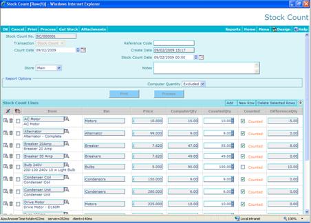 After the detail form with the document is opened, click “Change” icon to switch the form into the “change” mode. Before the counted quantities can be entered the Stock Count Date should be completed. As each figure is entered the “Counted” flag is selected, if a count is in “Dispute” then the “Counted” flag can be manually unchecked. Only lines with “Counted” flag checked will be taken into account when the document is processed. That gives the user an option of leaving some lines not counted and still processing the document: