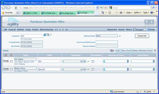 When all suppliers responded to quotations with their offers, the information needs to be entered back into the quotation document.