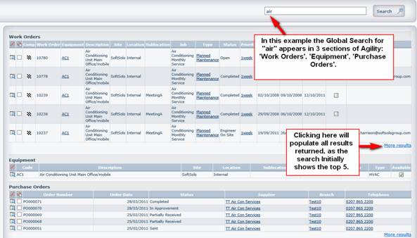 If what has been searched for appears in more than one field the Global Search will only return the 5 most popular results, if any more are available click on ‘More Results’ items highlighted below: