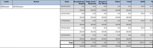 The report returns a tabular style grid showing for each employee in weekly or monthly bands the total time spent working on up to 3 different user selectable job types, the report also shows for comparison the total available hours from the shift pattern and the utilisation as a percentage of time recorded against the core shift time. Dependant on selected report options the report can also display the labour costs.