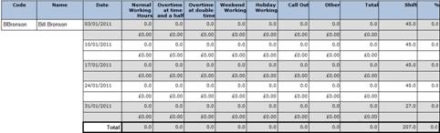 Similar to the labour utilisation report this shows the total time an employee has worked, but analysed by the pay rate, using weekly or monthly intervals. A calculation showing what percentages of the overall available hours were recorded at normal rate is also included.
