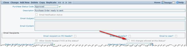 The choice of purchase orders status here is important as workflow behaviour is determined by the purchase orders status configuration. For example the purchase order status of approved does not allow changes to the purchase order. The above are provided as guidelines based upon pre-defined system status values.