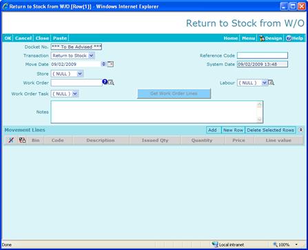 This transaction is used return items back into stock which have previously been issued against a Work Order but not used.