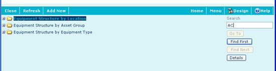 To perform a search, enter a Search String in the field at the top left of the Tree View Form and click on ‘Find First’. In the example below, the Records will be searched for the phrase ‘AC’: