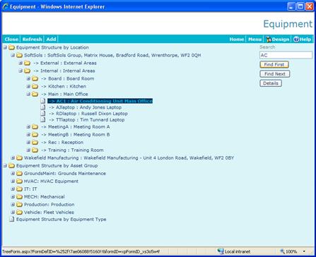 Tree View forms offer the functionality to search for records within the Tree Structure. This is a free text search facility, so will retrieve all records which contain the search string in the Tree Header Codes (in the example of the Asset Tree Structure this would search the Site Code, Location Code, Sub Location Code or Asset Code).