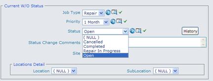 To push the asset for repair, change the Status of the W/O to “Repair in Progress” by using the Status drop down. This action will cause the Site field to refresh with following values: