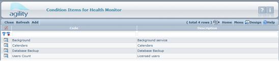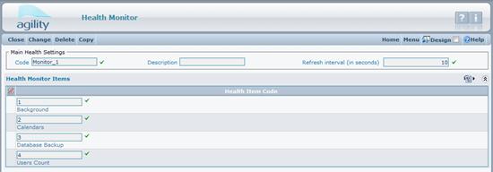 To define monitor you have to enter the code, refresh interval that says how often the monitor will refresh (checks all heath items), and put health items that will be checked during using the monitor.