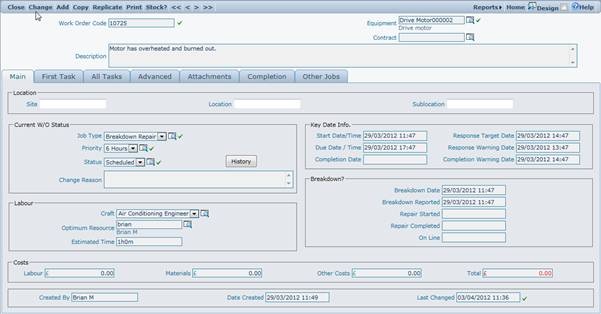 Above: Typical example of a fully populated work order detail form in enquire mode.