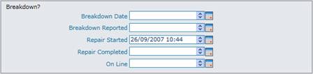 These dates are used for recorded and subsequent analysis of breakdown repairs, specifically in items such as MTBF and MTTR reports.