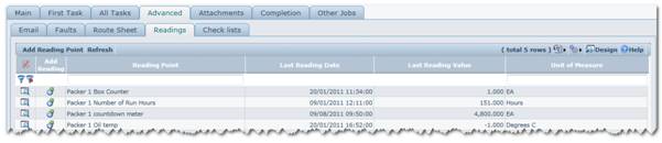 Any meter reading points associated with any of the equipment items specified on a work order, either as the main equipment item or route sheet items will be accessible from the readings tab.