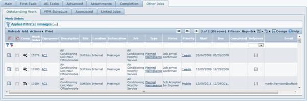 The other jobs tab contains a sub set of tabs that have information on works orders and planned maintenance schedules that exist against the main equipment item on the work order as well as information on linked jobs.