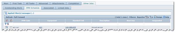 Within this tab a grid that details any PPM schedules that are defined against the main equipment item on the work order.