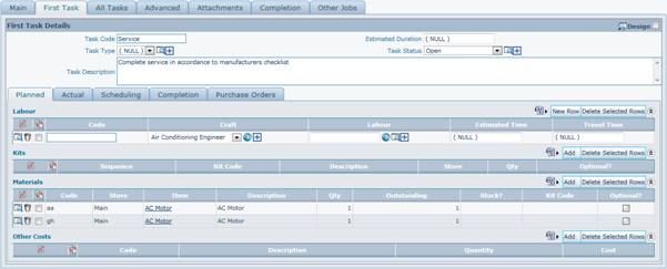 The first task tab contains details of the primary work order task; in the event that the work order is using multiple tasks then this will be the first task.