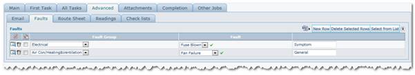 To manually add faults using this form when in change mode, click the new row option at the top of the grid and select the required options from the drop down selection lists. Or alternatively, click the select from list option. This will open a multi select grid of available faults that can be selected. Click the check box of the fault(s) that need to be added to the work order using the selection check boxes.