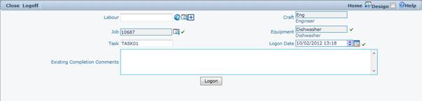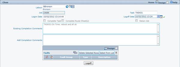 Logging off from a job is performed using the log off form. Click on the log on/off icon adjacent to the required that the user is currently logged on to. This will open the log off form.