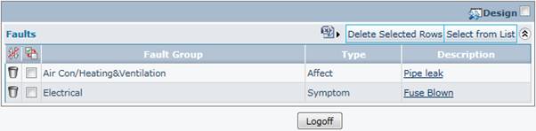 If any selected faults need to be removed from the grid. They can either be removed at this stage by clicking the check box on the unrequired row and clicking the delete selected rows button, prior to clicking the ‘Log Off’ button. Or they can be removed from the work order later.