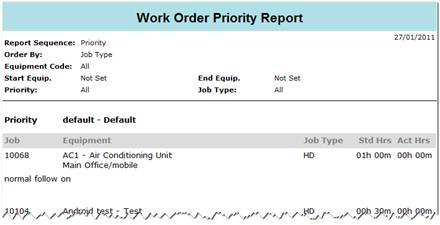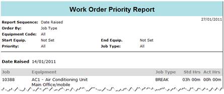 This is a work order listing report that returns work orders sorted and grouped by either priority or date dependant on the report type selected at runtime.