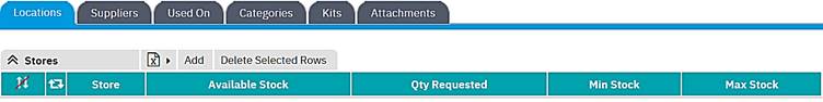 The Stores Grid shows the Store Locations, along with the available stock in that store, where the inventory item can be held.