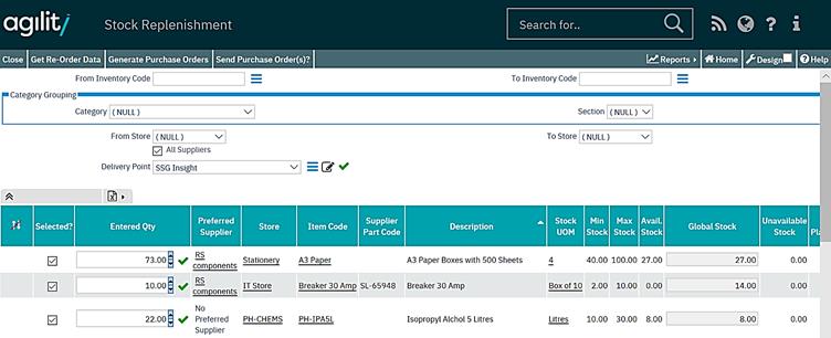 The user should examine the grid contents, de-select any items that they do not wish to order at this time and/or adjust any order quantities. Once that is complete then purchase orders can be automatically generated from the re-order data.